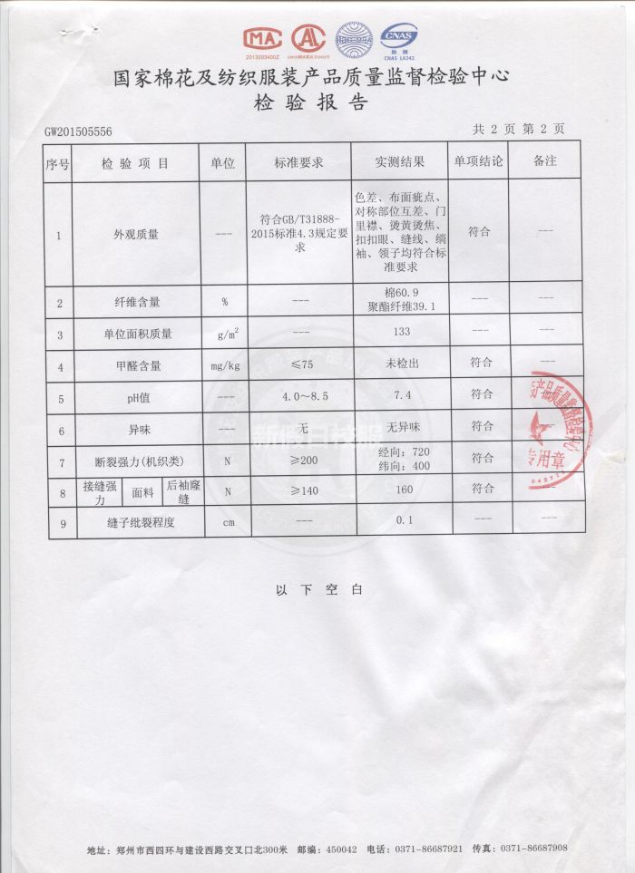 中小學(xué)生襯衣 檢驗合格報告