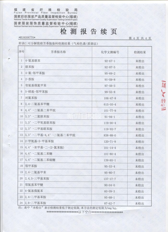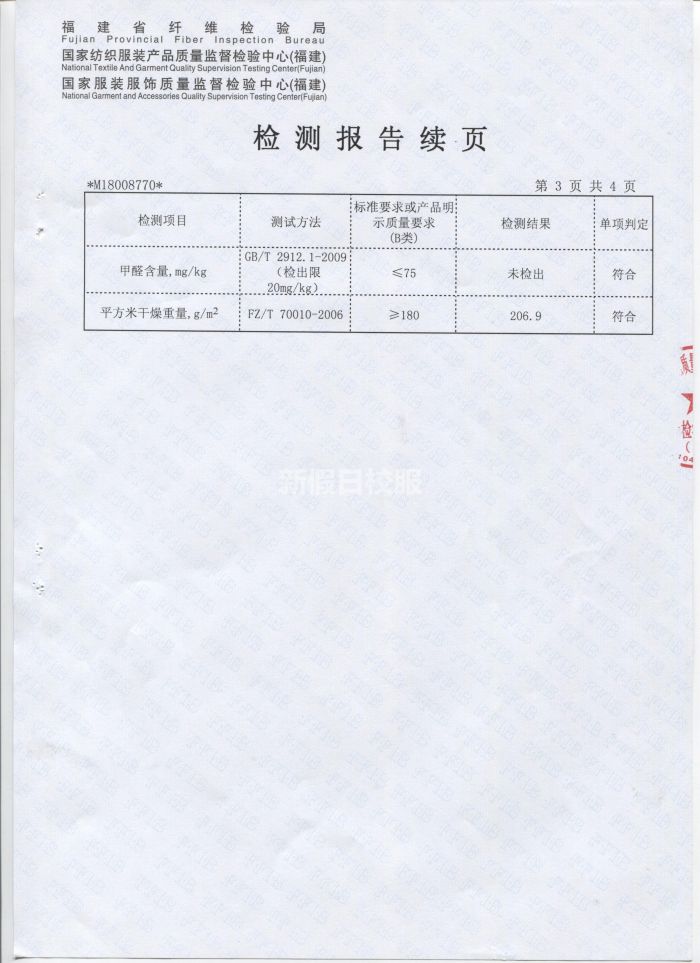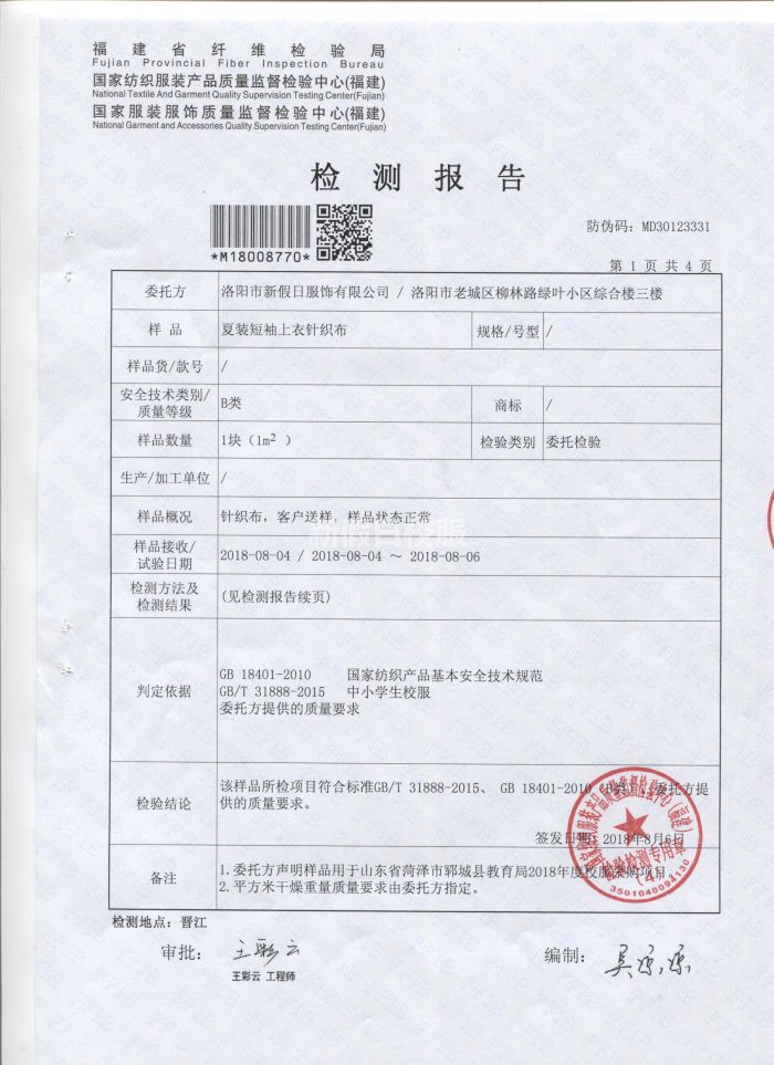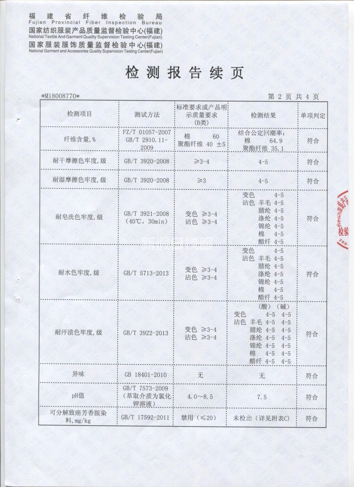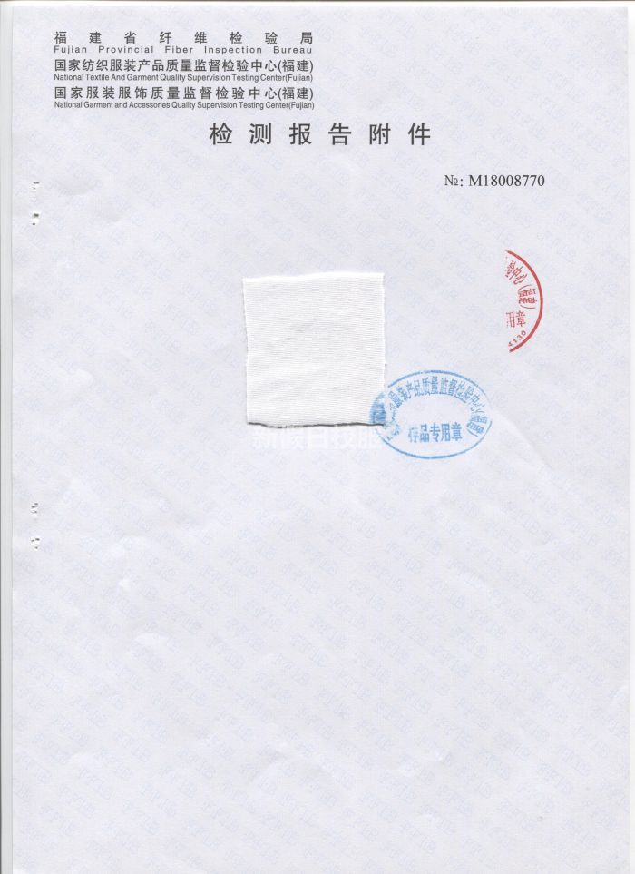 夏季短袖上衣針織布 檢驗合格報告